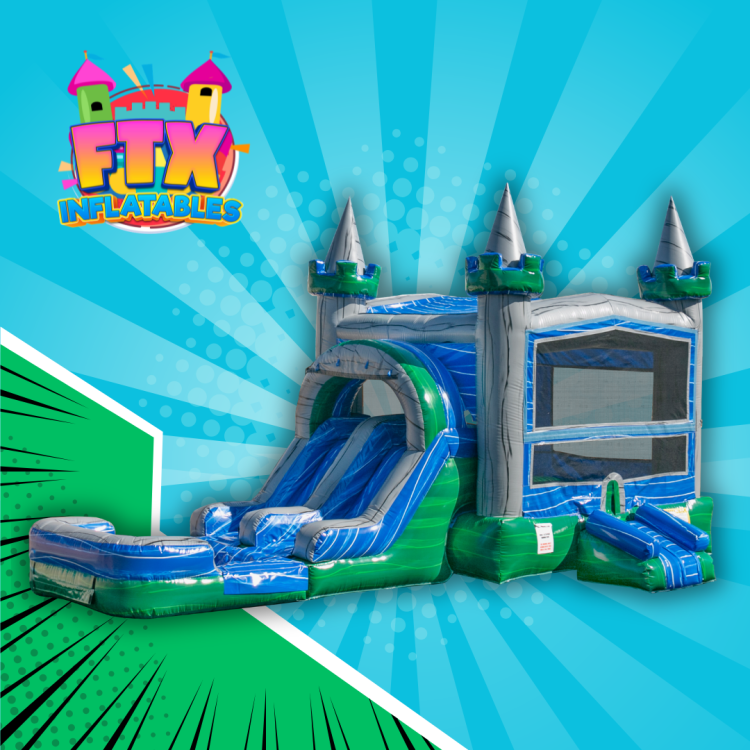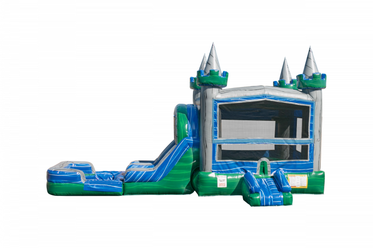 Looking for double the sliding fun? Our Lucky Emerald Dual Slide Combo has got you covered! This inflatable unit combines the best of both worlds: a large bouncing area and an exciting basketball hoop. Plus, it’s versatile! You can use it as either a dry slide or a thrilling water slide.
